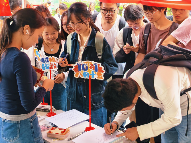 活动现场气氛热烈,投壶体验区,同学们在志愿者指导下尝试将箭支投入壶中,沉浸式感受传统民俗的竞技与礼仪魅力,现场不时传来成功投中的欢笑声。灯谜竞猜区悬挂着各式彩纸谜题,内容涵盖传统文化、国庆知识及校园文化等,同学们积极思考、互相讨论,在猜谜过程中增进了对节日内涵的理解。“青春告白祖国”心愿寄语板前也聚集了不少同学,大家纷纷执笔写下对祖国的真挚祝福与对未来发展的青春誓言,字里行间洋溢着浓厚的家国情怀与奋斗热情。整场活动组织有序、氛围轻松融洽,不仅营造了喜庆祥和的节日气氛,也进一步丰富了校园文化生活,提升了学生的文化认同与集体凝聚力。