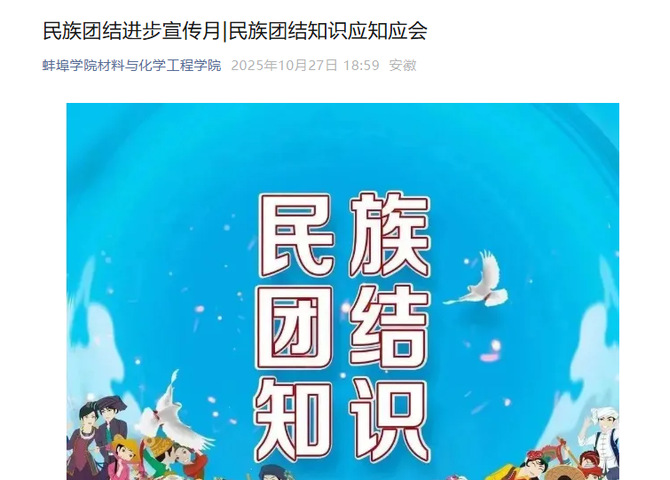 为了扩大民族团结进步教育的覆盖面,学院充分利用微信公众号等新媒体平台,推送习近平总书记关于民族团结的论述、民族团结知识等相关内容,让广大师生更加便捷地了解民族团结相关知识,营造了全员参与、共同学习的良好氛围,进一步增强学院师生维护民族团结、促进社会和谐的责任感和使命感。