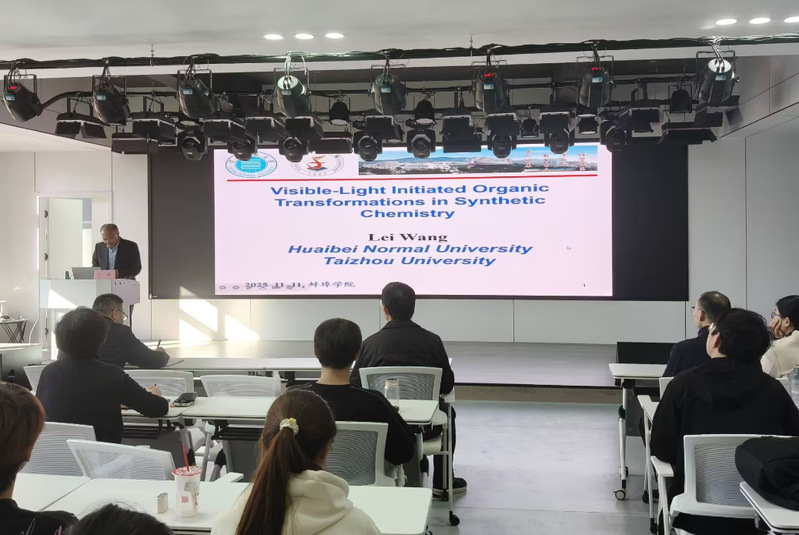 2025年11月11日,材料与化学工程学院邀请原淮北师范大学校长、党委书记,现任台州学院/淮北师范大学教授王磊来校进行学术交流,并做题为《Visible-Light Initiated Organic Transformations in Synthetic Chemistry》的学术讲座。讲座在5G双创中心310会议室举行,由院长葛金龙主持,材化学院师生200余人聆听了报告。