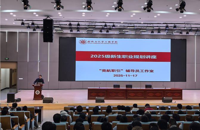 为帮助学生明确职业发展方向,破解成长困惑,11月17日晚,材料与化学工程学院在图书馆学术报告厅成功举办了2025级新生职业规划讲座。本次讲座由“竞航职引”辅导员工作室负责人汤骏主讲,学院党委副书记朱银邦主持讲座,新生辅导员、2025级全体学生、青马工程培训班学员共500余人参加。