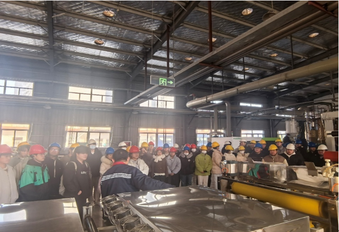 在安徽丰原生物技术股份有限公司,企业技术负责人赵伟业围绕企业发展历程及在生物基材料领域的产业布局进行了系统讲解。该公司作为国内生物制造行业的领军企业,以秸秆等可再生资源为原料,依托“乳酸—聚乳酸”全产业链核心技术,实现生物基材料的高效、绿色与规模化生产。师生实地参观了中试车间及产品展示中心,近距离考察聚乳酸合成工艺生产线及相关终端制品,将《聚合加工工程》、《高分子化学》和《高分子物理》等课程理论与现代生物制造前沿技术相结合,加深了对生物基材料从研发至产业化全过程的认知。