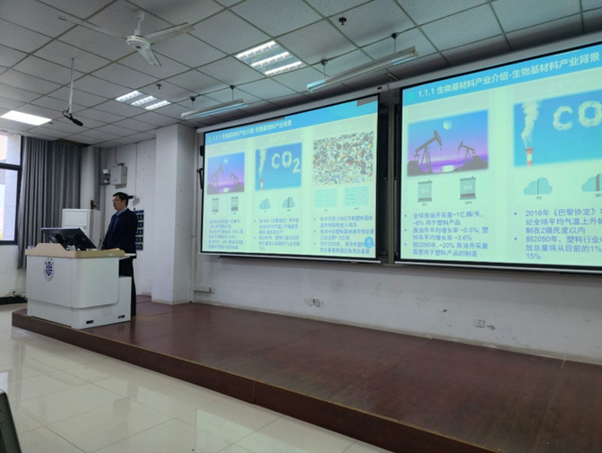 付松在生物基材料行业深耕多年,具有深厚的专业底蕴和丰富的从业经验,从“前沿趋势、核心科技、产业实践与职业发展”等多个维度进行了深入剖析。他详细解读了生物制造作为国家战略性新兴产业,在助力实现“双碳”目标和培育新质生产力方面的重要宏观趋势和战略价值;深入剖析了以秸秆为原料生产聚乳酸(PLA)的全产业链核心技术,尤其是非粮生物质转化、工业菌种构建等关键技术的创新突破。通过丰原集团的本土产业化实践和国际合作案例,生动展示了技术从实验室到市场的转化路径。他聚焦生物基材料在汽车、纺织等领域的广泛应用前景,分析了产业对高分子、生物工程等复合型人才的迫切需求,并为学生的专业学习及职业规划提供了宝贵的指导。