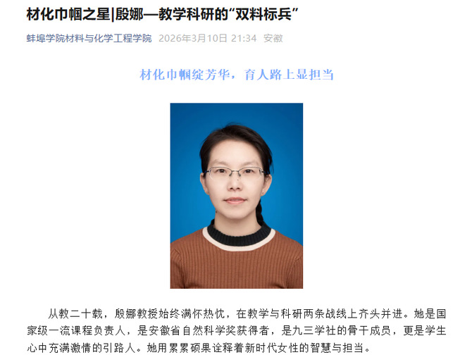 巾帼绽芳华,致敬“她”力量。三月伊始,学院启动“材化巾帼风采”先进典型推选宣传活动。围绕“三尺讲台·科研攻关·匠心育人·平衡之美”等核心维度,面向教学、科研、行政管理、学生服务等岗位,采取个人自荐与教研室推荐相结合的方式,推选“材化巾帼之星”先进典型。活动得到广大女教职工的积极响应,候选人皆为业绩突出、事迹感人的优秀女性代表。学院开设“三八节特辑·材化巾帼”专栏,通过官网、微信公众号等渠道广泛宣传先进典型,充分发挥示范引领作用,彰显新时代女性的别样芳华。